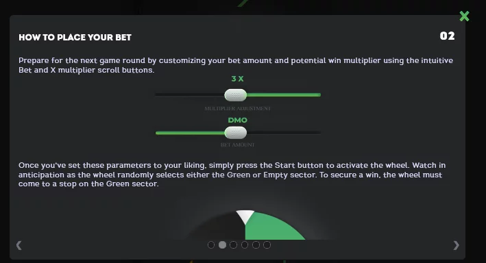| 🕹️ Gameplay Mechanics | Spin the wheel, win if it stops on green sector |